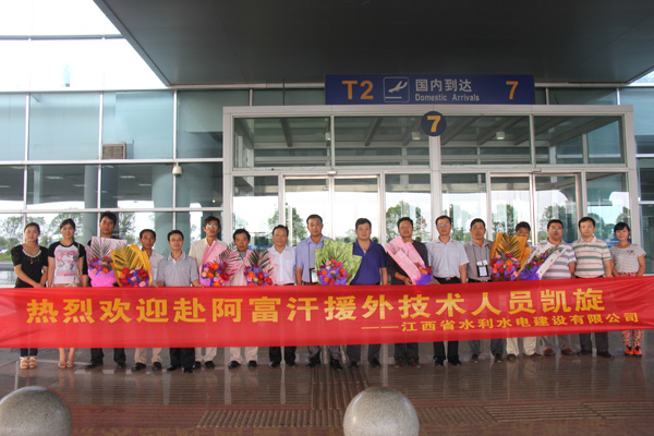 当公司援阿富汗项目手艺职员一行走出站口时,受到董事长、总司理王元旦等人的热烈接待,并收到公司员工送上的鲜花。王总饱含深情的说,你们辛勤了!接待你们凯旋,你们为祖国争得了声誉,为江西水建争得了声誉!