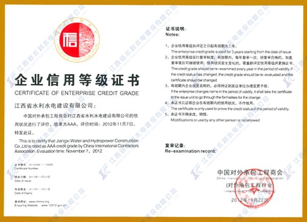 凭证商务部、国资委团结宣布的《商会协会行业信用建设事情指导意见》的要求,中国对外承包工程商会于2012年9月启动2012年度对外承包工程与劳务相助企业信用品级评价事情。经对外承包工程与劳务相助企业信用品级评审委员会第八次事情聚会审议,江西省水利水电建设有限公司被评定为2012年度对外承包工程企业信用评价AAA级信用企业。