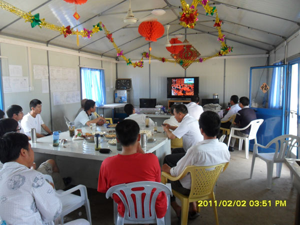 “金虎辞旧岁,玉兔迎新春”。2月2日,在祖国举国欢庆,万家团圆的时间,项目司理候学刚首先致辞。随后,公司副总司理黄郑民转达了公司董事长、总司理王元旦同志向战斗在外洋的同志们的亲热问候和优异祝愿,并总结了一年来项目部取得的可喜效果,对2011年寄于主体工程基本完工的希望,信托浇灌项目一定会是清静的、高效的。
