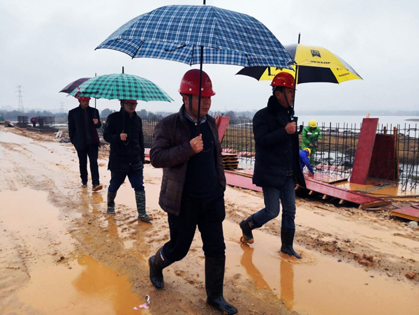 1月11日,由公司总工程师胡鸿煌、首席专家郭洪有、工程部副部长王海鹏组成的清静生产检查组,冒雨来到禾河大蹊径堤团结刷新工程施工2标段,举行清静生产、度汛清静检查。
